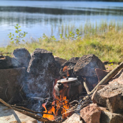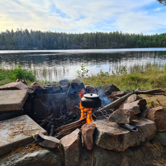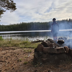 Gick till den stora eldstaden och gjorde upp eld, käkade ris och kyckling, drack lite kaffe och fick sällskap av såväl älgflugor som trollsländor.